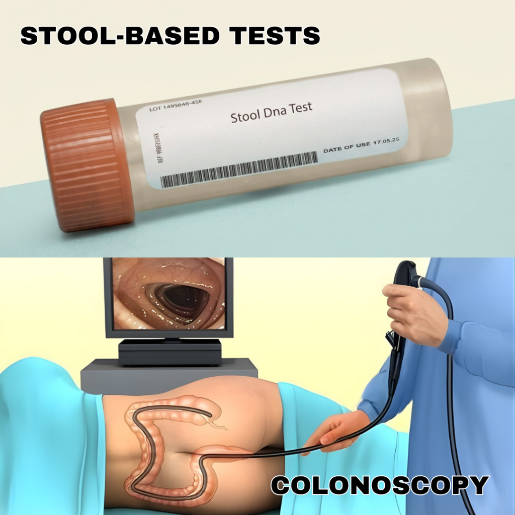 • Stool-based tests: Check for blood or abnormal DNA in the stool. These are done at home and repeated on a schedule.